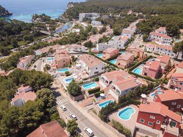 La villa se encuentra ubicada en una zona tranquila y residencial, segura, de ambiente familiar y a menos de 10 minutos andando de la espectacular playa de Cala Galdana.
